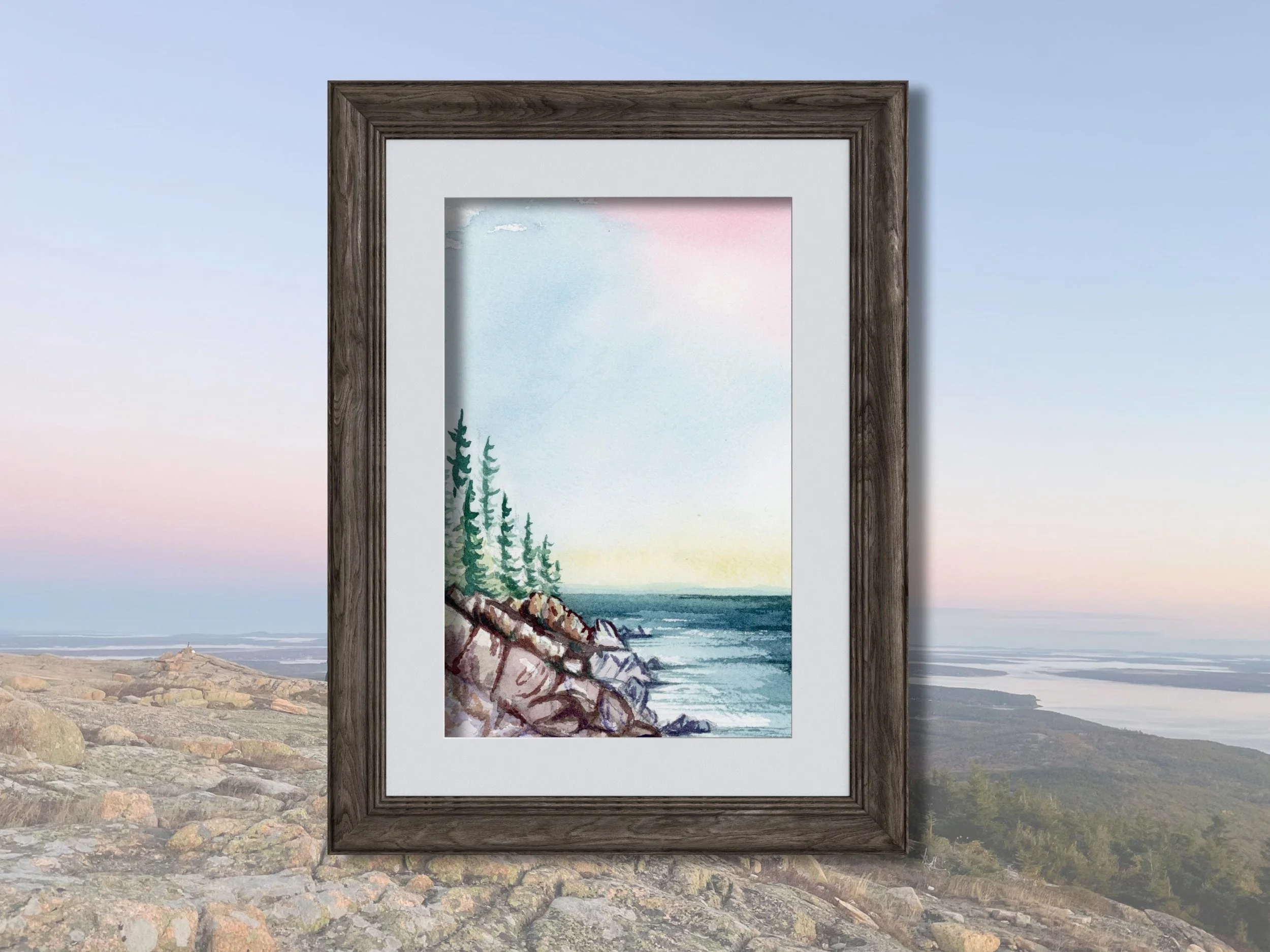 Bring the rugged beauty of Acadia National Park into your home with this fine art print of an original watercolor painting, featuring pine trees clinging to granite cliffs above the Atlantic Ocean. Inspired by Maine’s iconic coastline, this piece captures the sunset above the Bass Harbor cliffs!