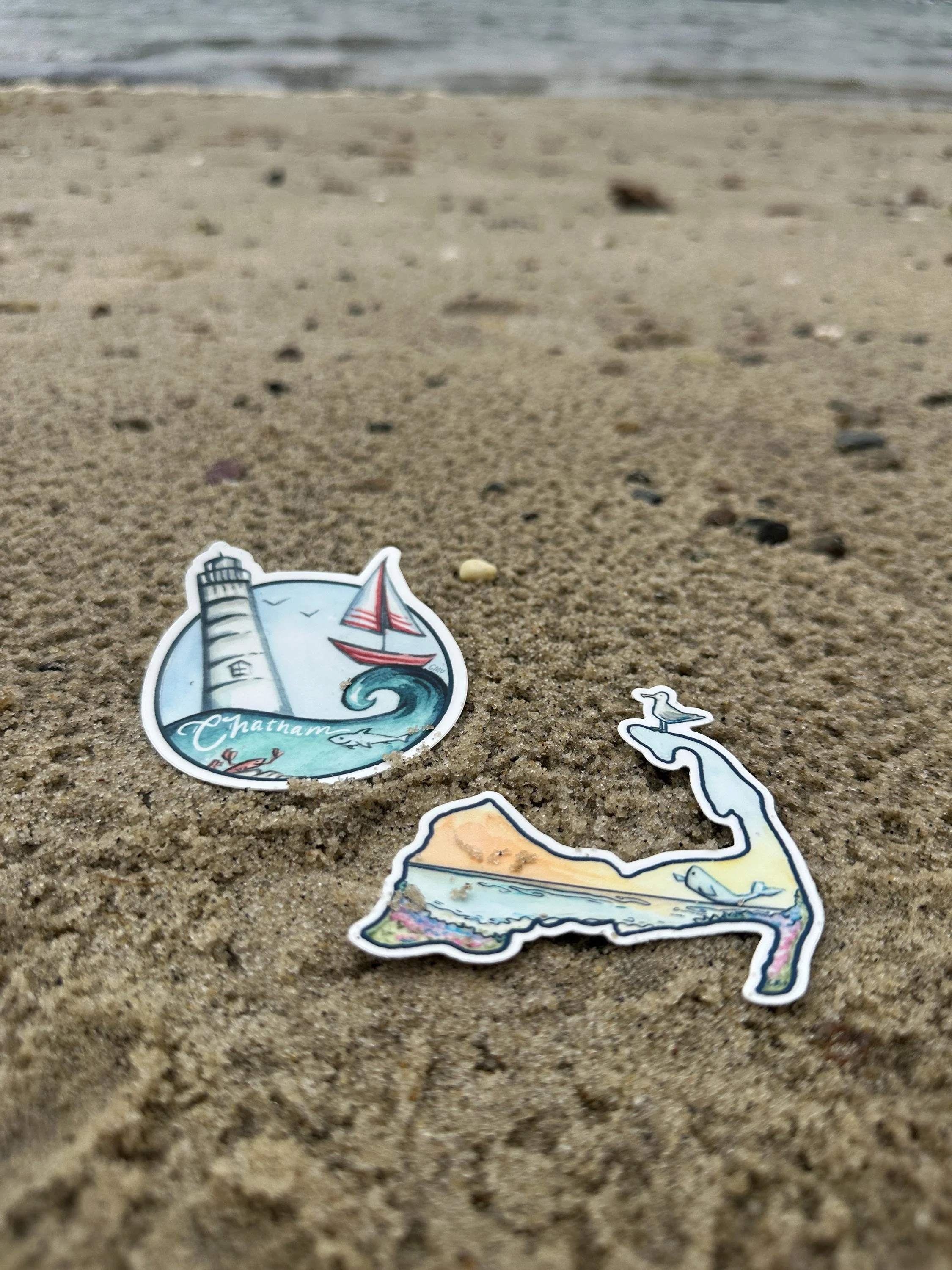 Cape Cod sticker featuring a playful seagull perched atop the iconic arm-shaped peninsula. Inside the silhouette, soft watercolor details show a peaceful ocean scene with a whale breaching offshore, sandy beaches, and coastal blooms!