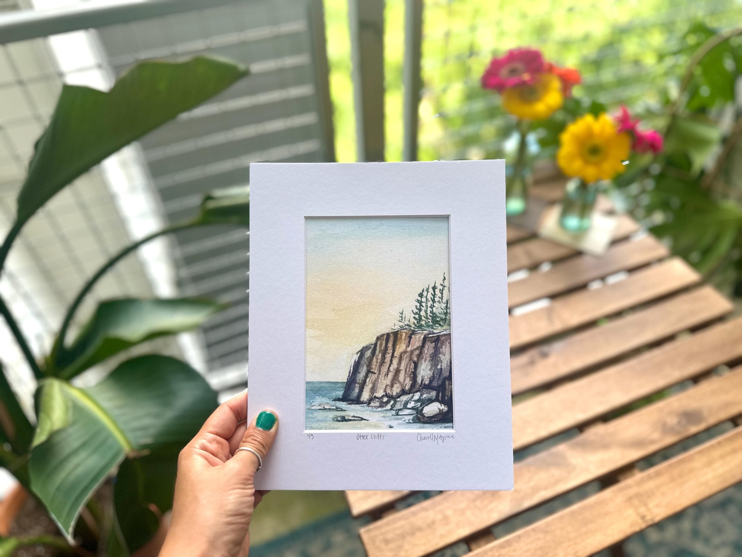 Bring the dramatic coastal beauty of Acadia National Park into your home with this fine art print of an original watercolor painting, inspired by the rugged cliffs and crashing waves of Otter Cliffs in Bar Harbor. This scenic coastline captures the raw, natural energy of Maine’s shores.